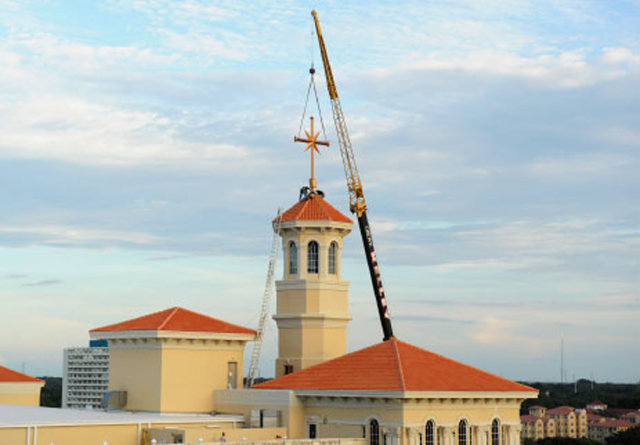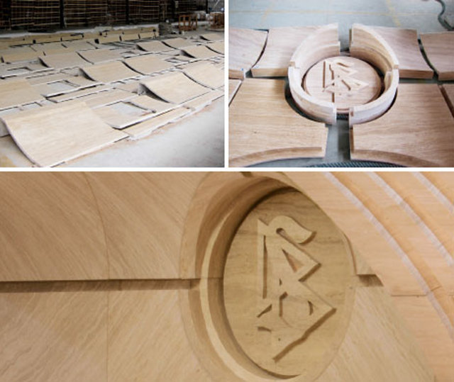 The flooring in the Chapel was fabricated from carefully selected “End Grain Wood,” cut at a 90-degree angle. Each piece of wood is about five inches by five inches and laid with the grain side facing upwards, producing a highly aesthetic character, color and durability. The floor was laid down over a two-month period.
