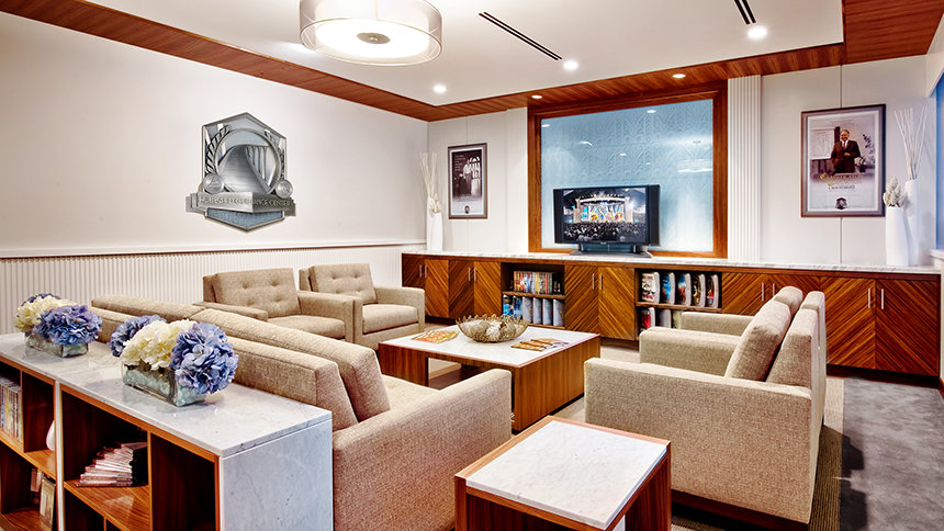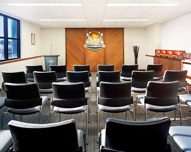 Formerly a functional building annexed to the 1928 Art Deco Cedars of Lebanon Hospital buildings designed by Claud Beelman, the massive reconstruction began in November 2009 and encompasses new walls, all new ceilings and finishes, as well as furniture constructed in-house at the Church’s state-of-the-art custom mill with imported wood and marble from Italy.